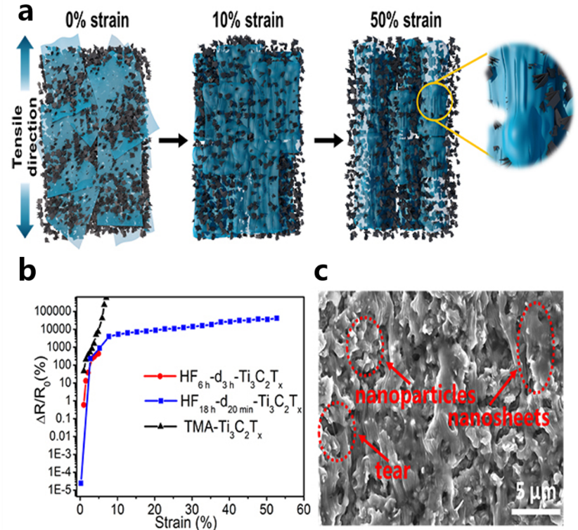 图a:基于Ti3C2Tx纳米颗粒-纳米片混合网络结构的应变传感器的工作原理;图b: Ti3C2Tx基传感器的相对电阻变化-应变曲线;图c: Ti3C2Tx纳米颗粒-纳米片混合网络结构的SEM图。