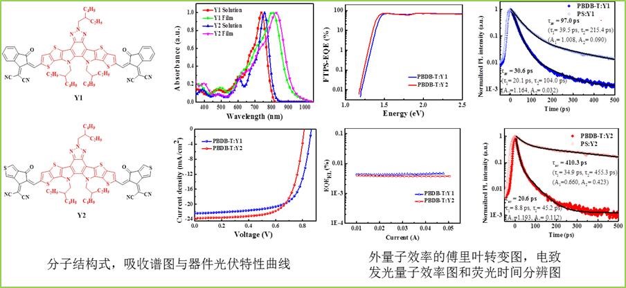 邹应萍教授课题组除了考虑有机太阳能电池材料能级匹配、吸收光谱互补和迁移率平衡外,还从热力学、空间构型等角度考虑材料的兼容性,在2017年首次将电子受体单元苯并三氮唑引入非富勒烯受体稠环中心核,形成一种DAD稠环结构,进而合成了A-DAD-A型有机小分子受体光伏材料。这种A-DAD-A型小分子受体可有效拓宽吸收光谱,降低器件电压损失,此分子设计策略为材料合成提供了新思路(ACS Appl. Mater. Interfaces 2017, 9, 31985−31992)。随后,保持中心核不变,用并二噻吩取代稠环两端的噻吩,将此分子体系从五元环拓展为七元环,并改变不同的端基,设计合成了Y1和Y2非富勒烯受体。邹应萍教授课题组与美国加州大学洛杉矶分校杨阳教授团队及瑞典林雪平大学高峰教授团队合作,经器件优化获得了12.6%的权威认证效率,该效率收录在2018年7月美国可再生能源实验室(NREL)“最佳电池效率”表中。