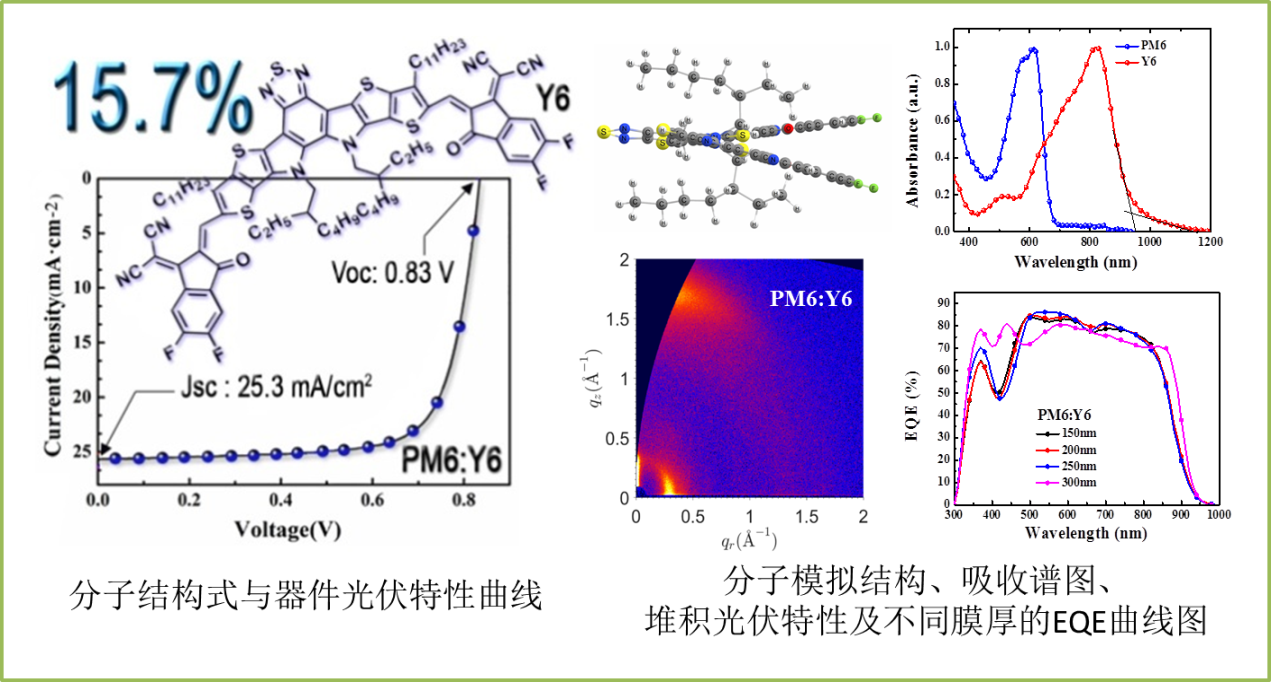 基于课题组提出的A-DAD-A型分子设计策略,进一步通过分子结构优化,将具有更高电子迁移率的苯并噻二唑替代苯并三氮唑引入到分子骨架中,在并二噻吩的β位引入烷基链调控溶解性和分子构象,设计合成了Y6非富勒烯受体。该分子具有较强的吸收和较窄的带隙(1.33 eV)以及优异的电子迁移率,制备了正向/反向器件的能量转换效率均为15.7%的单结有机太阳能电池(给体聚合物为PM6),为已报道的单结有机太阳能电池效率的世界最高纪录。这一成果对单结有机太阳能电池的研究具有极其重要的推动作用。有机太阳电池将来大面积印刷制备中的一个瓶颈就是活性层对厚度较强的依赖性,一般情况下,太阳能电池器件的能量转换效率达到最佳的活性层厚度局限在100nm左右,而当此共混薄膜厚度增至300nm时,器件依然可以保持13.6%的能量转换效率,这对于有机太阳能电池的大面积制备非常重要。此项工作对有机太阳能电池未来工业化生产(卷对卷技术)具有积极的影响。