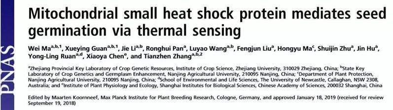 种子如何感受环境中温暖条件的变化?2019年2月15日,由农学院张天真团队等完成的研究论文在PNAS在线发表,一个小分子热激蛋白(small heat shock protein)HSP24.7直接感应温度的变化,调控种子的萌发,部分回答了这一问题。HSP24.7的功能研究揭开了植物温度感受分子调控的一角,在作物种子生产、保存和育种中都具有重要的应用意义,尤其是对新疆(生产全国70%以上的棉花产量)低温、干旱、盐碱地的棉花播种出苗有实际指导作用。