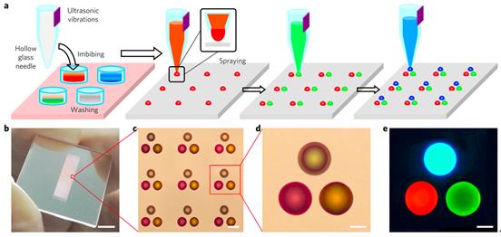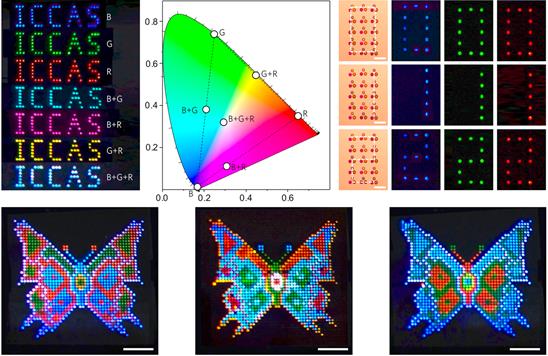 最近,研究人员充分发挥有机材料在溶液加工方面的优势,利用喷墨打印的方式精准构建了红绿蓝微纳激光阵列作为显示面板(图1),实现了主动发光激光显示,解决了当前激光投影显示无法用于手机、平板、可穿戴设备等领域的问题。在制得的面板上,每个像素点都由三个独立的红绿蓝激光器组成。远场图像表明,这样制备的像素点具有良好的混色效果,且色域覆盖范围超过标准RGB空间的45%(图2)。在一块3×5阵列面板上实现了三原色的数字显示,通过颜色混合可以得到其他的各种颜色。除数字外,该面板还能够实现所有字母的混色显示。进一步地,选用较大面积的阵列面板能够动态显示更加复杂的图案。利用这种主动发光的激光面板还可以实现图案的动态显示,用于信息滚动播出,视频播放等。该工作为发展高性能、易加工的平板激光显示及照明器件提供了一种可行的解决方案。相关工作发表在Nature Communications2019, 10, 870.