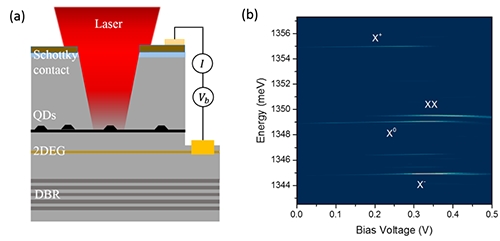 | 图 1 (a)器件结构示意图;(b)电压调制的单量子点发光光谱。 |