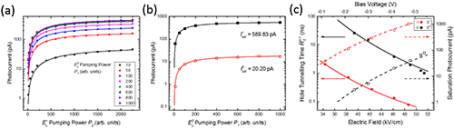 | 图 3 (a)(b)X+的两步饱和光电流,图(b)中红线为X0的饱和光电流;(c)空穴隧穿时间和饱和光电流随电场的变化。 |