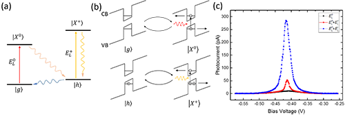 图 2 (a)双色共振激发X+光电流示意图;(b)X0和X+的光电流产生示意图; (c)双色激发的X+光电流谱。黑线为单色激发X0的光电流谱。红线与蓝线的 的功率比为50:1500。 |