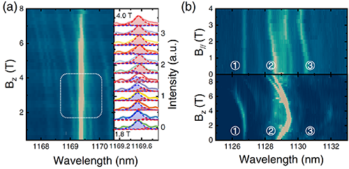 | 图1 (a) s-shell在垂直磁场下的磁光光谱。其中包含一个强耦合过程。 (b) p-shell在水平和垂直磁场下的磁光光谱。其中一些峰如①所示,在水平磁场下没有变化,在垂直磁场下呈现正抗磁。而另一些特别的峰,如②③所示,在水平磁场下可以观测到抗磁,并且在垂直磁场下呈现出抗磁反转。 |