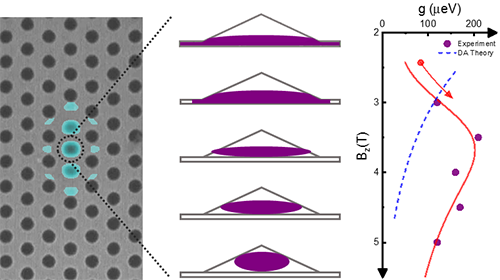 | 图4 (左) L3型光子晶体微腔的结构示意图和模场分布图。(中)量子点波函数随着磁场收缩示意图。(右)耦合强度随磁场变化。其中圆点为强耦合数据,红线为图2中弱耦合下的数据,蓝线为偶极近似理论的预测。 |