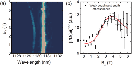 | 图2 (a) p-shell激子态在垂直磁场下的抗磁反转。(b) 根据实验测得的p-shell激子态强度以及与腔膜的失谐,计算得到的耦合强度随磁场的变化。 |