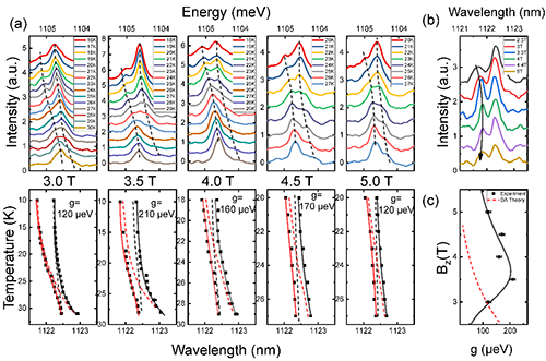 | 图3 (a) 3-5T垂直磁场下,光谱随温度的变化 (上图),及其强耦合下反交叉的拟合(下图)。(b) 4.2K下的抗磁翻转。(c) 耦合强度随磁场的变化。黑点为强耦合的数据,灰线为图2中弱耦合的数据。 |