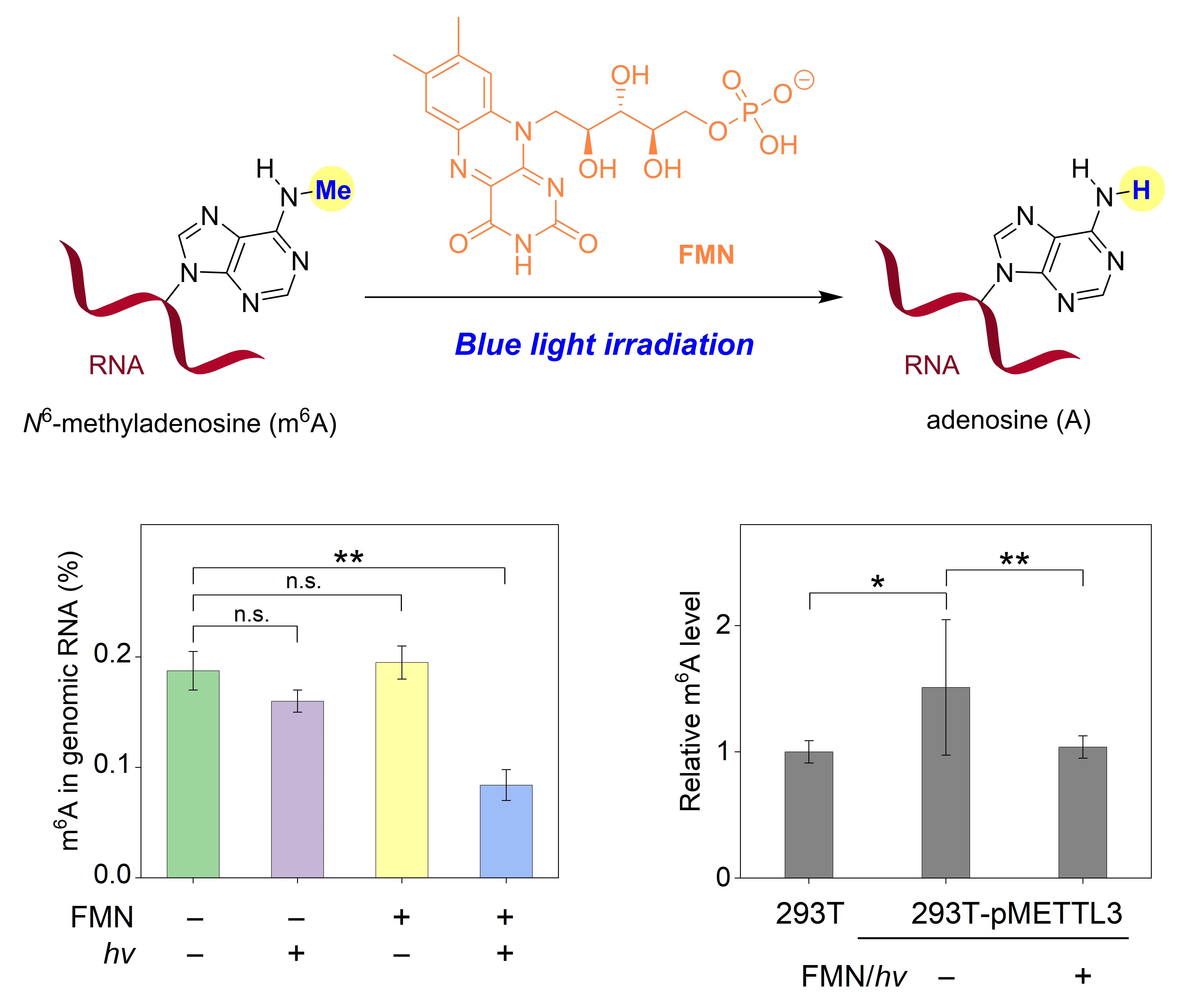 RNA的表观遗传修饰是RNA调节基因表达的化学基础,利用新反应技术和新分子工具对RNA修饰进行精准调控对揭示RNA介导的遗传信息表达网络具有重要意义。然而由于RNA本身的不稳定性,使得在活细胞水平进行化学调控变得异常艰难。N6-甲基腺嘌呤(m6A)是真核生物最常见和最丰富的一种修饰,占甲基化修饰的80%以上。m6A修饰广泛参与调控mRNA的剪接、运输、稳定性和翻译效率等,并且与肥胖和肿瘤等多种生理功能异常及疾病相关。发展能够直接与m6A修饰进行相互作用的小分子化合物,以此实现在细胞水平上特异性识别m6A修饰并且进行选择性调控,更加精确地描绘RNA的修饰动态过程及其效应,具有十分重要的生物学意义和应用价值。 在国家自然科学基金委、科技部和中国科学院的支持下,中科院化学所分子识别与功能院重点实验室程靓研究员团队长期从事该领域的基础研究,发展了一系列针对重要RNA表观遗传修饰的高选择、高灵敏、时空分辨的化学转化、荧光标记的原理和方法。他们前期报道了首例在蓝光照射下,维生素B2选择性促进核苷水平的m6A去甲基化研究(Chem. Commun.2017, 53, 10734),为后续在细胞水平调控m6A奠定了基础。最近,他们和活体分析化学院重点实验室汪铭研究员课题组合作,首次实现了化学小分子对RNA表观遗传修饰的直接干预。研究表明,核黄素单核苷酸(FMN)作为人工去甲基化酶,能够利用细胞中的氧气实现核苷、寡核苷酸以及活体细胞水平上的m6A去甲基化。FMN的作用方式是特异性地氧化N6-甲基取代的腺苷,而不是传统的作为甲基化酶的抑制剂或去甲基化酶的激动剂。即使在甲基化酶过表达的细胞中,FMN依然可以有效地下调m6A的表达水平,表明FMN有望作为新型的靶向m6A修饰的小分子抑制剂进行开发,对治疗由m6A过表达引起的生理疾病以及深入研究m6A的生物学功能提供了候选化合物。相关成果发表于Angew. Chem. Int. Ed. DOI: 10.1002/anie.201900901。