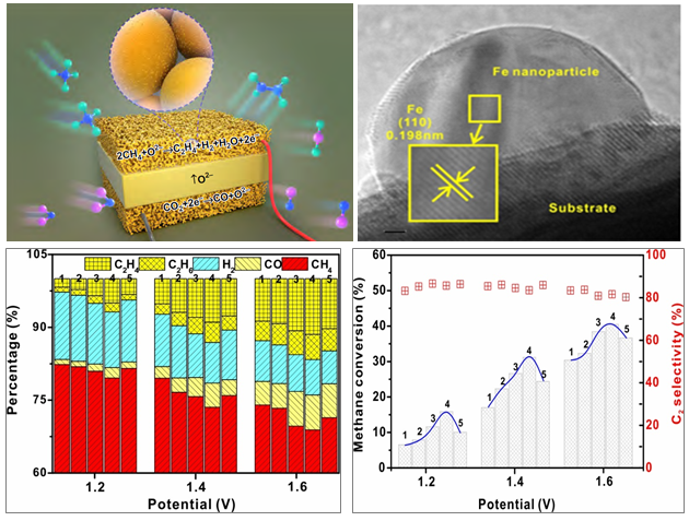 该工作通过对Sr2Fe1.5Mo0.5O6-δ(SFMO)掺杂并在表面铆合生长纳米铁构筑金属-氧化物界面体系,以增强对CH4的活化和纳米金属稳定性以及抗积碳性能。协同调控金属-氧化物界面长度和外电场实现陶瓷电极对CH4氧化性能的调变。常压下实现了16.7%的C2产物浓度,CH4转化率可达41%,运行100小时无衰减。相关研究结果发表于Nature Communications (https://www.nature.com/articles/s41467-019-09083-3)。