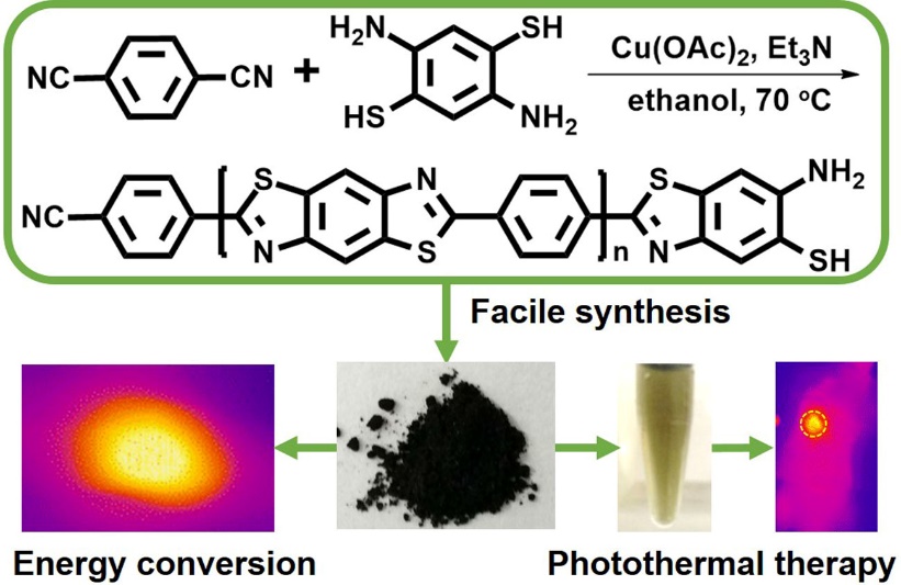 研究人员一直致力于合成具有高的光利用率及光热转换效率的光热材料。除了一些碳基纳米材料,共轭聚合物是一种前景广阔的光热材料。但是目前用于共轭聚合物的单体和具有优异光热性能的共轭聚合物非常少。梁高林教授课题组基于前期发现的CBT-Cys点击缩合反应(Nat. Chem. 2010, 2: 54-60),重新设计反应原料,用相对温和的反应条件,非常便捷地高产率合成出了具有良好光热转换性质的共轭聚合物PPBBT及其衍生物(见下图)。在模拟太阳光源的氙灯照射下,PPBBT与明星材料单壁碳纳米管具有可比的升温速率和光热转换效率。利用纳米沉淀技术,王育才教授课题组将PPBBT包裹得到稳定分散在水里纳米粒子NPPPBBT。原位瘤模型小鼠实验证明,该纳米粒子可被动靶向富集在肿瘤部位并具有优异的肿瘤光热治疗效果。这种新方法提供了便捷合成更多共轭聚合物的途径,在生物医学或光电等领域有着极大的应用前景。