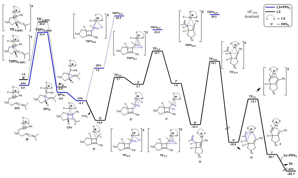 在此基础上,他们对该反应机理进行了系统的理论计算研究。结果表明,该反应经过一条不同寻常的环化途径,即Rh正离子作为π酸活化炔基,经5-exo-dig环化形成5/3并环Rh卡宾中间体,随后经一系列扩环、Rh辅助的C-H键活化/烯基异构化、C-C键活化、还原消除等过程完成催化循环,得到目标产物。在该过程中C-H键活化/烯基异构化过程是决速步骤,同位素标记实验也证实了这一点。该研究不仅首次实现了Rh(I)催化的不对称联烯-炔环异构化反应,展现了Rh(I)独特的催化活性和应用价值,理论计算研究也为此类反应提供了新的认识,为新的催化体系的设计提供了依据。