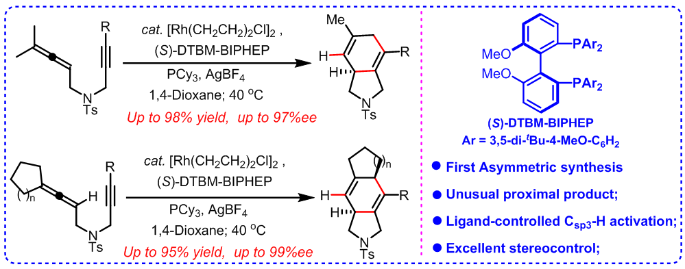 继2016年成功实现(E)-1,6-烯炔不对称环异构化后,课题组进一步将该反应拓展至1,6-联烯-炔底物,成功发展了Rh(I)-SegPhos-PCy3催化体系,首次实现1,6-联烯-炔不对称环异构化反应,该反应通过新颖的5-exo-dig环化,可高效、高选择性制备一类具有氮杂5/6环系产物。值得一提的是,该反应也可适应于联烯末端含环状片段的底物,可一步制备高度挑战性的5/6/6或5/6/5环系产物,在复杂天然产物和药物合成中具有潜在的应用价值。