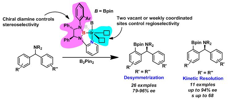 过渡金属催化的不对称碳氢活化反应为构建手性分子提供了一条经济、简便和环境友好的途径。然而,当前的不对称碳氢键官能团化反应主要以碳碳键形成为主,碳硼键的形成反应仍然是一个极具挑战性的课题。比如,铱催化的碳氢键硼化反应是目前为止研究得最为深入的,且区域选择性控制也取得了很大的进展,但是其高效的催化不对称硼氢化反应仍然需要共价键导向,且只有两个例子。这方面研究的匮乏主要是由于缺少合适的手性配体来加速此类反应。从反应机理上而言,在铱催化的碳氢键硼化反应中有两个硼基是不参与反应的,因此有可能将其用作手性的支持配体实现不对称碳氢键硼化反应。