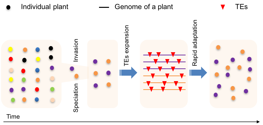 该研究表明,遗传多样性很低的物种能够通过转座子的大量扩增,快速产生遗传变异,并导致开花时间等关键适应性状的变异,从而提高其适应能力。该研究揭示了“生物入侵的遗传悖论”一个可能原因,即转座子的“爆发”产生的遗传变异可以使遗传多样性很低的物种能够快速适应新生境。