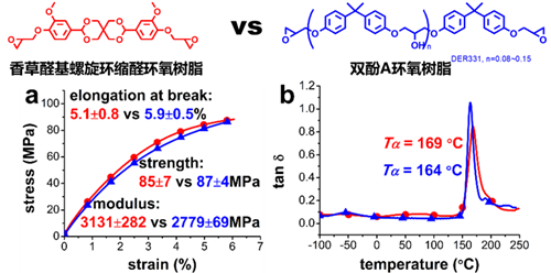 图1 香草醛基螺旋环双缩醛环氧树脂(红)与双酚A环氧树脂(蓝)性能对比