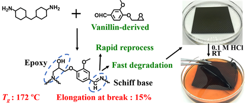 热固性树脂具有优异的机械性能、热学性能、尺寸稳定性、加工性能以及化学稳定性等,在电子封装材料、复合材料、胶粘剂及涂料等领域都具有广泛应用。然而由于其高度化学交联的三维网络,热固性树脂很难回收,同时也影响了其下游产品包括碳纤维复合材料、电子产品等的回收。赋予热固性树脂可降解性被认为是解决热固性树脂回收问题的一条重要途径。然而对于含一般降解基团如酯键、二硫醚键、碳酸酯键等的热固性树脂,化学交联密度低时,降解速度快,但热学、力学性能差;化学交联密度高时,综合性能尤其是热学、力学性能好,但降解性能差甚至难降解。要实现高化学交联密度下的快速降解,一条有效途径就是采用易可控降解的基团。
