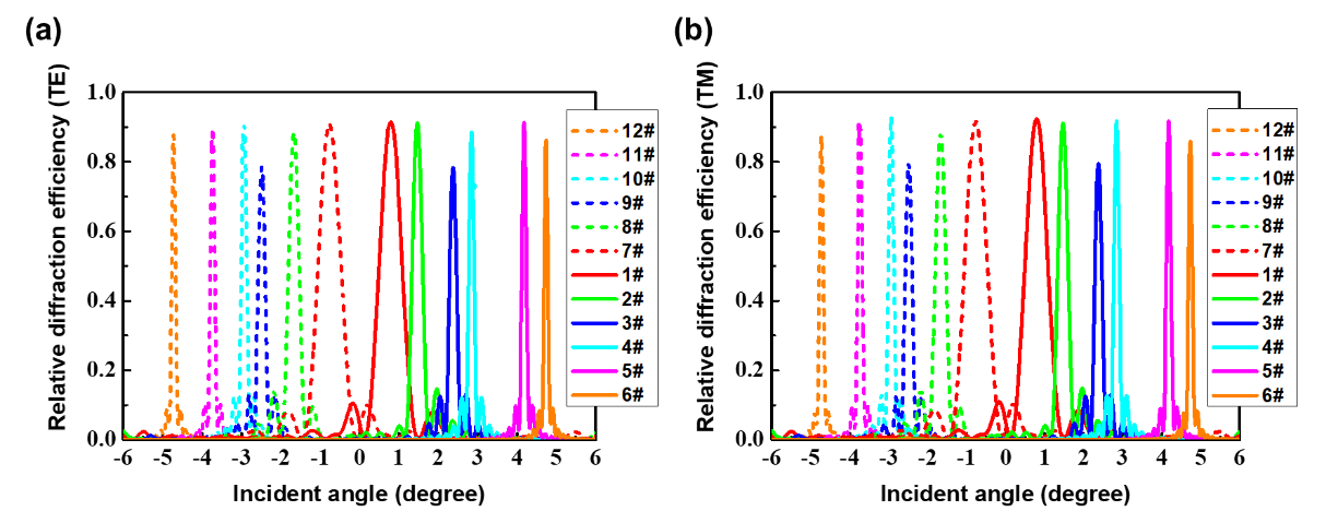 图2 TE偏振态(a)和TM偏振态(b)下角度放大器各个通道的角度选择性曲线