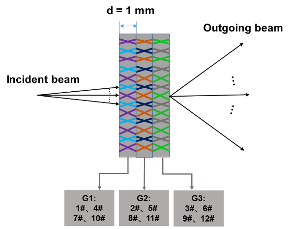 在该项研究中,研究人员综合考虑了光热敏折变玻璃的最大折射率调制范围、较小的吸收损耗和走离距离要求、多通道之间的串扰影响,以及激光发散角对体光栅衍射效率的影响等因素后,进行了角度放大器的多参数优化设计。理论分析结果表明,光热敏折变玻璃的最大折射率调制范围和激光光束的发散角是限制体光栅各通道最大衍射效率的主要因素。多块多通道复用体光栅级联的方式可以有效解决这一问题。此外,通过对称的光栅通道设计,每块4通道光栅只需搭建2套曝光光路,大大提高了复用体光栅的制备效率。将多次曝光和单次热处理得到的几块复用体光栅依次级联,实验上实现了-45°~45°的一维大角度离散偏转,各通道衍射效率达80%以上并表现出偏振无关特性。该项工作为基于复用体光栅的角度放大器的理论设计和实验制备提供了清晰详实的指导,对促进复用体光栅在光束大角度连续偏转系统中的应用具有重要意义,同时也为基于复用体光栅的二维角度放大器的实现奠定了基础。