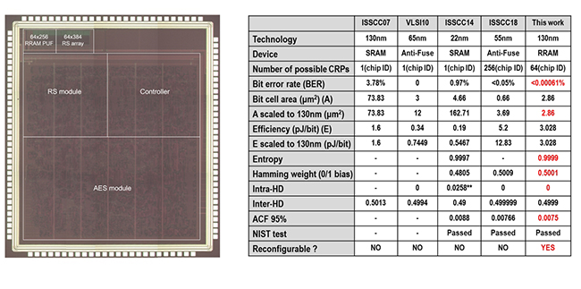 针对传统集成电路PUF的不足,利用RRAM的优势,清华大学微纳电子系博士研究生庞亚川在ISSCC2019上首次介绍了一种基于RRAM电阻随机性的可重构物理不可克隆函数芯片设计。该报告提出了一种电阻差分方法用于产生PUF输出以消除工艺固有偏差以及电压降(IR drop)的不利影响。为了在电路层次实现该方法,该团队设计了一款高精度的灵敏放大器电路以精确比较两个RRAM器件的电阻。大量的测试数据显示所设计的RRAM PUF与之前的工作相比,具有最低的原始比特错误率、最小的单元面积、最好的均匀性以及独特的可重构能力,能够有效抵抗物理攻击,具有很好的发展潜力。