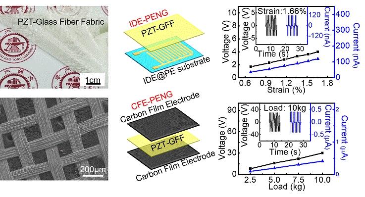 同时,利用玻璃纤维布的微观刚性,首次发现压电纳米发电机的形变与信号输出之间呈线性关系,可望在柔性传感领域获得重要应用。另外在这种多层级结构的玻璃纤维布基底上沉积宽光谱吸收高压电活性压电材料还有望能够同时收集光能、热能和机械能。这项工作为制造高性能,超柔性,低成本的纳米发电机及柔性传感器提供了新的视角,可望在柔性可穿戴设备领域获得应用。论文共同第一作者为上海交通大学的硕士研究生贺思博和英国华威大学的董文博士后研究员,郭益平教授为论文的通讯作者,上海交通大学为第一单位完成。郭益平教授所带领的智能与能源复合材料研究小组长期致力于铁电/压电功能复合材料,能源及催化材料的基础和应用研究,研究工作得到了国家自然科学基金重点项目和面上项目(11474199和51332009)的资助。