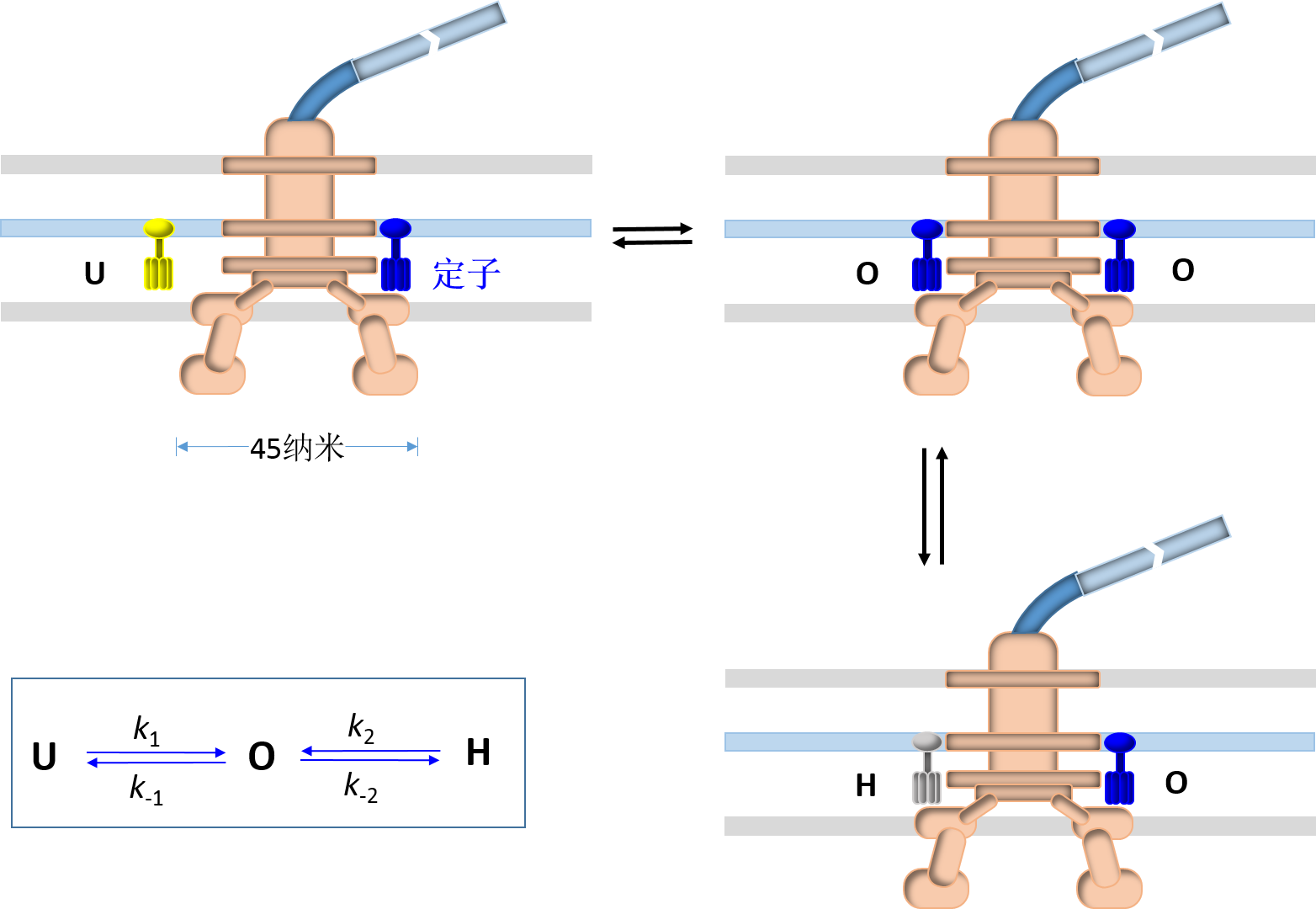 图.马达定子在三态之间转换的示意图:U为脱离态,O为结合态,H为暗态。每个马达最多可有11个定子,这里只画了2个,其中右边定子一直处在O态,左边定子在三态之间随机转换。左下图为三态动力学模型。