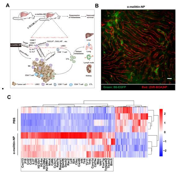 图:肝血窦内皮细胞的靶向标记与免疫调控。(A)α-melittin-NP通过特异调控LSEC抑制肿瘤肝转移的机制示意图; (B)活体荧光成像监测α-melittin-NP对LSEC的靶向标记能力,标尺为20 μm;(C)LSEC上调及下调的差异性基因热图。