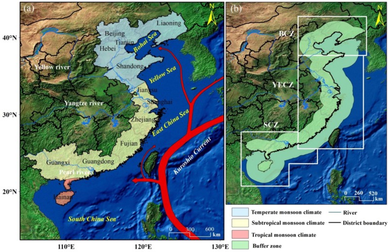 在全球变暖背景下,中国海岸带陆地和海洋温度都在快速上升,并且上升速率高于全球平均值。陆海温差是海-陆间热力对比的重要表征,对区域气候有显著影响。我国大陆海岸线北起鸭绿江口,南至北仑河口,长达1.8万多千米,气候类型南北差异大。基于此,作者以海岸线为界,向陆海各缓冲200千米作为研究区,将中国海岸带划分为渤海,黄-东海和南海三个区域。利用ERA-Interim再分析资料和18个CMIP5气候模式数据,分析了中国海岸带当前(1979-2014)和未来(2005-2100)陆海温差时空变化特征。