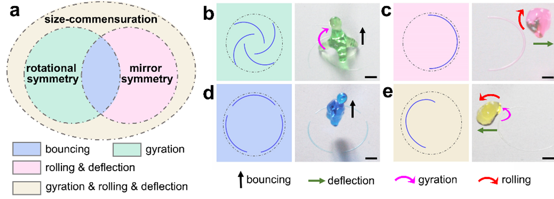 在上述研究的基础上,他们与清华大学冯西桥教授团队合作,通过图案化浸润性表面实现了对液滴撞击过程的精准调控。当液滴到该基底后,基底表面的不同区域对铺展液膜具有差异化的粘附力,使液膜形成不对称的回缩行为。非向心的粘附力对液滴形成力矩,其作用效果随着液膜的回缩逐渐累积,最终在液体内部产生角动量,使液滴发生旋转。通过结构优化,液滴旋转速度最高可达7300转每分。该过程实现了液滴碰撞前后平动能向转动能的转化,突破了经典的牛顿碰撞定律描述范畴,也为液体表面能的利用和液滴碰撞行为的精确调控提供了全新的思路。相关研究成果发表在Nature Communications杂志(Nat. Commun., 2019, 10, 950)。该工作被Nature杂志选为研究亮点(“Putting a spin on droplets”),Science也以“These falling drops don’t splash—they spin”为题进行了专题报道,并受到C&EN, New York Times, Phys.org, Daily Mail, Der Tagesspiegel等众多媒体的关注。