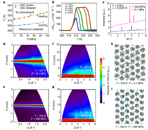 金属所研究人员和日本大阪大学Takeshi Sugahara副教授合作,利用高压微量热仪测量了NPG在高压条件下的等温熵变,发现在45.0MPa压力下熵变已经达到最大值——389 J kg-1K-1,且在15.2 MPa下已经达到了最大值的一半(图3b)。这一驱动压力较传统压卡效应材料低很多,具有明显的应用优势。接下来,在日本大型同步辐射光源SPring-8 Saori I. Kawaguchi博士、Shogo Kawaguchi博士、Koji Ohara博士、陈艳娜博士、Osami Sakata教授的协助下,分别在BL02B2谱仪和BL04B2谱仪进行了高分辨同步辐射X射线衍射和高压同步辐射X射线衍射测量,发现压力可以驱动材料发生从无序到有序的相变(图3c)。最为关键地是在日本散裂中子源(J-PARC)中子科学部Kenji Nakajima主任、Yukinobu Kawakita副主任、Seiko Kawamura博士、Takanori Hattori博士和Tatsuya Kikuchi博士的全力支持和多方协调下,突破重重技术难关,在极短时间内成功实现了高压超高精度准弹性中子散射测量。利用世界上能量分辨率最高的冷中子时间飞行谱仪AMATERAS和特殊设计加工的高压样品腔,获得了高压环境下NPG样品的准弹性中子散射谱,直接从原子层次揭示了压力对分子取向无序的抑制是产生庞压卡效应的本质原因(图3d - g)。这一实验结果也被美国佛罗里达州立大学Shangchao Lin助理教授组的分子动力学模拟结果所证实(图3h,i)。同时与澳大利亚核科技组织(ANSTO)的Dehong Yu博士、Richard Mole博士合作,在时间飞行谱仪PELICAN上获得了完整的晶格动力学数据,发现了强烈非简谐特征。