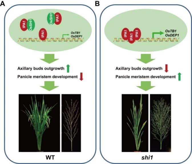 研究人员筛选到了一个新的水稻株型发育突变体 shi1 ( short internode1 ),其分蘖数减少、茎秆粗壮并且穗分枝数显著增加。通过图位克隆的方式获得了目的基因 OsSHI1 ,该基因编码植物特异转录因子,主要在腋芽及幼穗中表达。通过酵母双杂交筛选发现,OsSHI1与理想株型调控因子IPA1互作。后续功能研究表明,OsSHI1能够抑制IPA1对下游靶基因 OsTB1 及 OsDEP1 启动子的结合活性,影响其基因转录功能,进而协同调控水稻株型的发育。