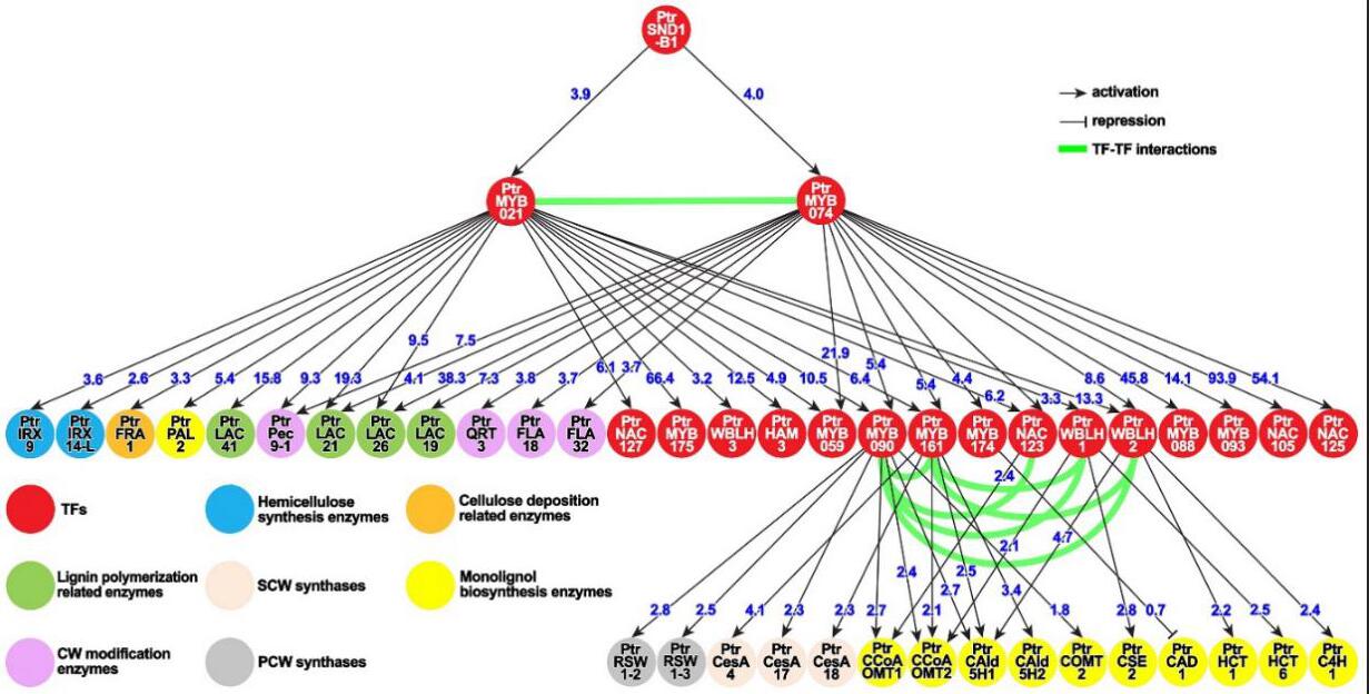 林木遗传育种国家重点实验室姜立泉研究组和李伟研究组合作,利用毛果杨木质部原生质体系统(Linet al., 2014, Nature Protocols),整合转录组学和染色质分析数据,构建了以关键转录因子PtrSND1-B1介导的木材形成转录调控网络(Transcriptional Regulatory Network, TRN)。该调控网络包括四个层级,具有定量调控特性的TF-DNA互作构成了一个特异性调控关系,即转录因子的调控如何通过这些互作被转导,从而激活用以木材形成的细胞壁基因(也称木材形成的效应基因)。研究发现,PtrSND1-B1介导了57个特异的TF-DNA直接互作,研究人员在30种基因型的转基因毛果杨中对这57种直接互作中的42种进行体内检测,其中约有90%的互作均在体内发挥作用,表明该TRN具有非常高的准确性。同时,TRN揭示了存在于不同转录因子中的共同调控靶点,进而发现了9种新的TF蛋白复合物(蛋白二聚体和三聚体),这些复合物参与调节特定类型木质素的生物合成。通过对转录因子PtrSND1-B1介导的转录调控网络研究,揭示了木材形成的过程可能涉及到一种调控稳态,这种体内的调控稳态则由TF-DNA互作调控和TF-TF(蛋白-蛋白)互作调控的组合共同决定。