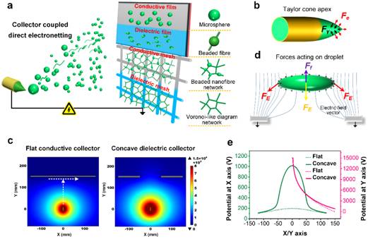 (二维纳米蛛网材料的设计与开发(a)静电喷网技术示意图,(b)泰勒锥尖端受力分析,(c)接收器耦合诱导电场分布,(d)荷电液滴微电场形变,(e)电势vs位置分布线)