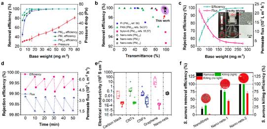 (二维纳米蛛网材料的多功能应用(a)空气过滤性能,(b)透光性能,(c)液体分离性能,(d)过滤循环再生性能,(e)导电性能,(f)生物防护性能)