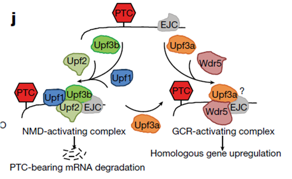 这种无义突变mRNA介导的降解途径叫“NMD”途径(Nonsense mRNA Mediated Decay pathway),是一种mRNA质量监控机制,就好比工厂在生产产品的过程中的质检,当产品达不到要求时,会自行销毁次品,不然会带来更严重的后果。NMD介导的降解过程中,与无义突变mRNA结合的EJC蛋白复合体招募上游移码蛋白3b(Upf3b)是降解次品的关键步骤。而Upf3b的双胞胎“兄弟”Upf3a同样可以与EJC蛋白复合体结合却不参与降解反应,但科研人员对于Upf3a存在的生理意义不得而知。