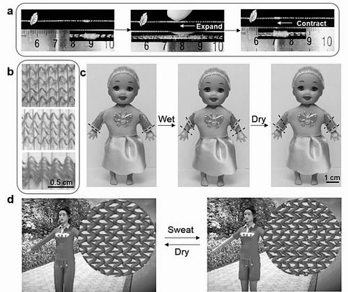 正值季节变换,当你跑步的时候,穿短袖太冷,穿长袖太热,如果有一种服饰,能够根据体温、湿度自动调节长度,当身体出汗时,长袖变为短袖,汗干之后又恢复如初,那将多么神奇。如今,这种酷炫的智能织物有望成为现实。