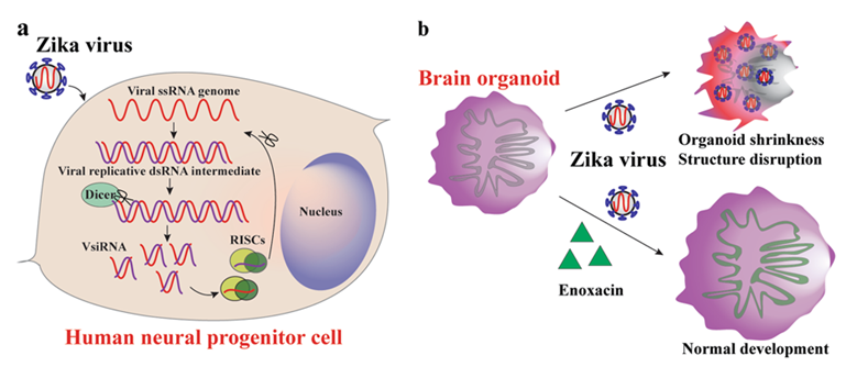 在本项研究中,该合作研究团队从寨卡病毒对hNPCs独特的感染嗜性入手,首次在病毒自然感染的条件下证明了RNAi抗病毒免疫在人类细胞中的重要抗病毒作用。此外,hNPCs中RNAi抗病毒通路的存在为相应抗病毒药物的研发提供了新的靶标。研究团队发现一种临床上广泛使用的“老药”依诺沙星能增强hNPCs内的RNAi活性,在hNPCs及由此分化产生的类脑器官(brain organoid)中显示出非常高效的抗病毒作用,阻断了寨卡病毒感染所致的小头畸形表型。该项研究表明,RNAi作为一种抗病毒免疫机制在人类神经发育早期发挥着重要的抗病毒作用,是人类抗病毒免疫体系的重要组成部分之一。
