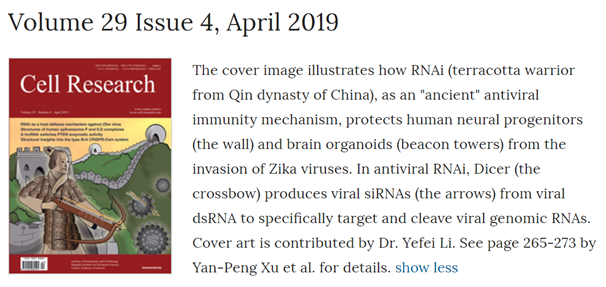 该研究成果以“Zika virus infection induces RNAi-mediated antiviral immunity in human neural progenitors and brain organoids”(《寨卡病毒感染在人神经前体细胞与类脑器官中激发RNAi介导的抗病毒免疫》)为题,作为封面文章发表在2019年第4期Cell Research(《细胞研究》)上。同期杂志上还刊登了著名病毒学家史佩勇(Pei-Yong Shi)教授的评述文章---“Anti-Zika virus RNAi in neural progenitor cells”(《RNAi免疫在人神经前体细胞中的抵御寨卡病毒》)。