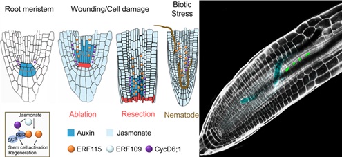 在特定逆境胁迫下,植物通过茉莉酸途径抑制主根生长而促进侧根发生(Sun et al., 2009, Plant Cell; Chen et al., 2011, Plant Cell)。中国科学院遗传与发育生物学研究所李传友研究组前期的研究发现,在这些生理过程的背后,茉莉酸途径的核心转录因子MYC2直接调控干细胞转录因子PLT1/2的表达,进而激活干细胞组织中心(静止中心)的细胞分裂活性(Chen et al., 2011, Plant Cell),从而调控根系的适应性生长。最近,他们与荷兰瓦赫宁根大学Ben Scheres教授团队的合作研究发现,损伤诱导的茉莉酸信号可以激活干细胞并促进再生。他们的研究表明,茉莉酸通过调控RBR-SCR分子网络和胁迫响应基因ERF115的表达从而激活根干细胞组织中心的活性。同时,位于ERF115上游由茉莉酸信号诱导表达的ERF109可以激活CYCD6;1转录,从而促进再生。进一步研究结果表明,来自土壤的机械胁迫以及线虫侵害能够激活茉莉酸介导的再生反应。