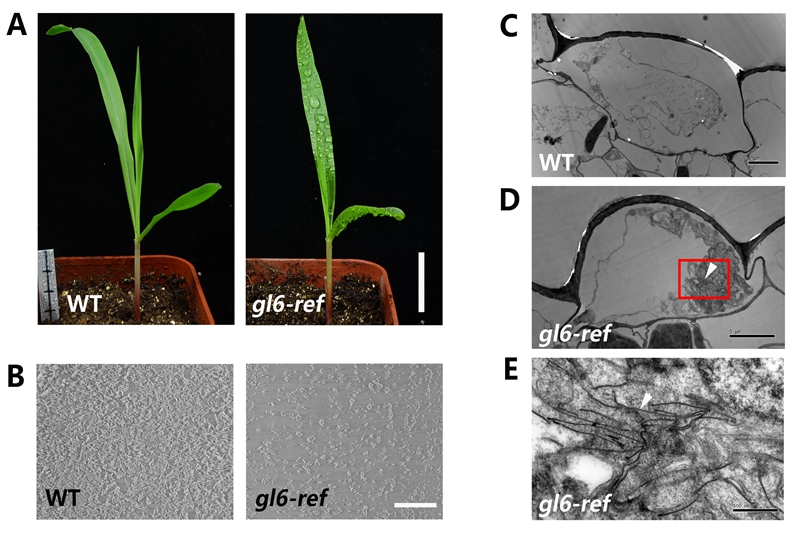 该团队研究人员发现玉米glossy6(简写为gl6)突变体表现出典型的表皮蜡质累积减少的表型,且该表型缺陷导致玉米苗期对干旱敏感。研究人员使用分子生物学手段定位并克隆了gl6基因,还发现gl6基因编码一个未知功能结构域蛋白,进一步研究结果显示此蛋白可能参与了玉米表皮蜡质的细胞内转运。该研究为解析玉米及其它植物表皮蜡质的细胞内转运机制提供了新的思路。