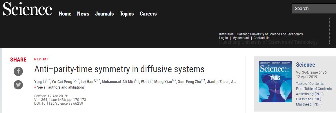 新闻网讯(通讯员 刘欢)4月12日,《科学》(Science)杂志在线发表了我校物理学院和创新研究院祝雪丰副教授与美国斯坦福大学和新加坡国立大学的合作研究成果:《扩散系统中反宇称时间对称性》(Anti-parity-time symmetry in diffusive systems)。我校物理学院2014级博士生彭玉桂为该论文共同第一作者,祝雪丰副教授为论文共同通信作者。