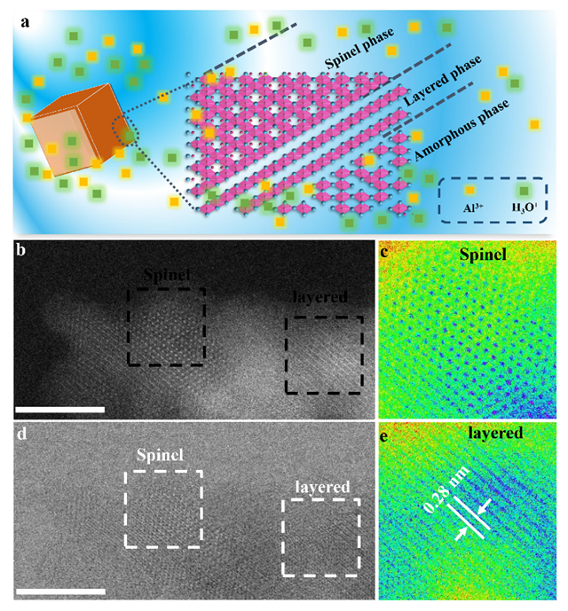 利用球差校正电镜可以观察到材料原子级别的排布,在电流和水系电解液的作用下,四面体位的Mn2+和部分八面体位Mn3+从尖晶石结构中溶出,在电流作用下被氧化形成的无定形相重新沉积在原本的纳米颗粒表面,所以在球差电镜中可以清晰地看到尖晶石、层状和无定形相混合存在的现象。表面的含水无定型层结构有利于铝离子的嵌入脱出,使得正极材料具有快速脱嵌铝离子的能力。
