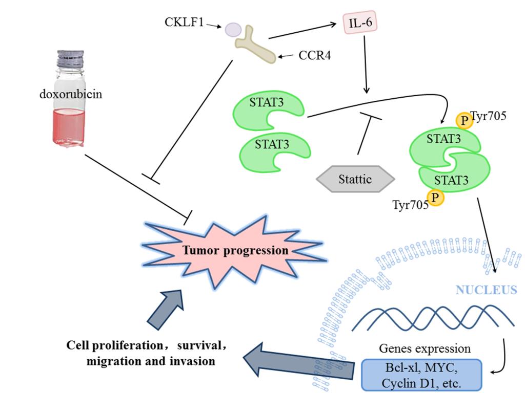 该课题组首次发现在原发性肝细胞癌组织中明显高表达,并与原发性肝细胞癌的进程及不良预后密切相关,进一步研究表明CKLF1能通过炎癌转化的重要信号通路IL-6/STAT3诱导肝癌细胞的恶性转化,最终导致原发性肝细胞癌的转移。此外,该课题组还发现CKLF1能通过IL-6/STAT3信号通路抑制经典抗癌药物多柔比星对肝癌细胞的杀伤作用,影响治疗效果。该研究揭示了CKLF1在原发性肝细胞癌中所扮演的重要角色,从全新的角度诠释了原发性肝癌中炎癌转化的机制,为原发性肝癌的靶向治疗及耐药性研究提供了新的思路。
