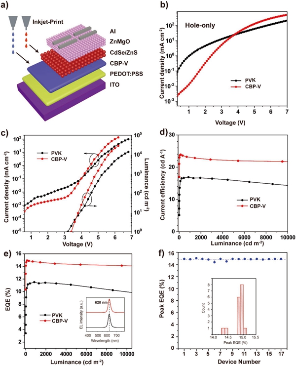 图3. (a) 喷墨打印QLED器件结构图;(b) 但空穴器件;(c) J-L-V 曲线,(d) CE-L 曲线(e) EQE-L 曲线;(f) 17 组器件的外量子效率统计图;QLEDs 的电致发光光谱也展示在c 图中