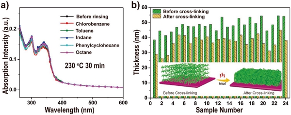 图2. (a) 各种溶剂清洗交连前后CBP-V 薄膜的紫外吸收光谱图验证抗溶剂性; (b) 交连前后CBP-V薄膜厚度的变化
