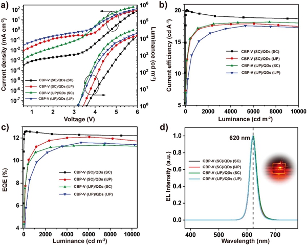 图4. (a) J-L-V 曲线;(b) CE-L 曲线;(c) EQE-L 曲线;(d)不同溶液法制备的器件的电致发光光谱(SC: 旋涂, IJP: 喷墨打印);(d)图中插入的图片为双层印刷的红光QLED (2 mm2)