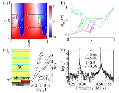 外尔(Weyl)半金属是一种三维固体材料,具有许多独特的特性,如手性异常和拓扑费米弧表面态等。近期,人们已经将外尔物理研究推广到三维声子晶体中。本文利用简单的一维声子晶体外加两个额外的结构参数,构造、合成了虚拟的三维空间以及外尔点(图1),探索外尔材料中的物理现象。基于精确的超声实验,研究人员不仅第一次直接观察到了合成空间中的外尔点(图2),还验证了与合成外尔点拓扑稳定性相关的反射相位奇异性(图3),进而检测了该合成体系中的拓扑非平庸界面态及其传输特性。