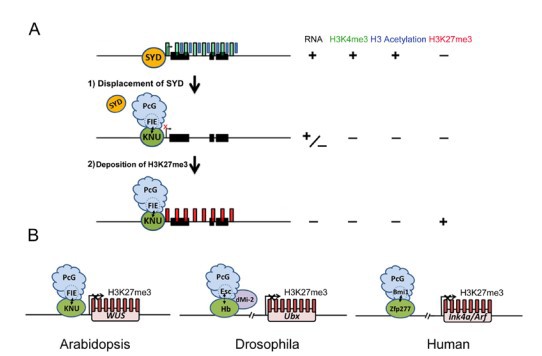 孙博教授课题组的该研究成果阐明了KNU对WUS的调控机制。 KNU被激活后,KNU与WUS启动子结合并导致WUS 基因的激活蛋白SPLAYED(SYD)被“驱逐”,从而使得WUS 基因的转录水平迅速降低。并且,KNU还与关键的PcG因子 FERTILIZATION INDEPENDENT ENDOSPERM(FIE)互作,并招募PcG复合体在WUS基因位点上生成H3K27me3抑制性修饰,来维持对WUS基因的抑制(如图)。这一多步骤的 WUS 基因的沉默机制导致了花干细胞的终止并保证了心皮的正常发育。
