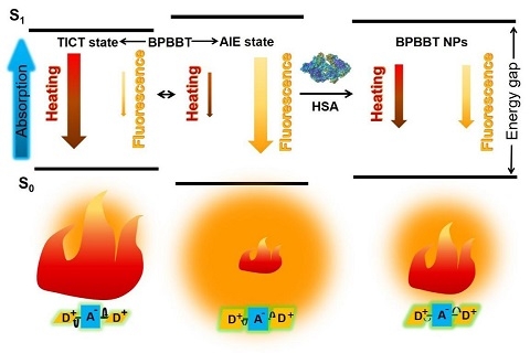 术中荧光成像具有分辨率高和成像快速的优点,可引导外科医生术中更清楚地区分微小肿瘤与正常组织。然而,目前临床使用的术中荧光探针的激发和发射波长在可见光范围,成像深度有限,组织自发荧光干扰强。如果能够找到一种成像深度更深、背景干扰低的近红外荧光探针分子,它同时还具有吸收光能转化为热能并产生热消融的光热转化性能,就可以实现对术中检测到的微小肿瘤实施光热治疗,从而杀死肿瘤细胞。因此,发展兼具光热转化性质的诊疗一体化近红外荧光探针制剂,是术中诊疗微小肿瘤技术能够临床转化所亟需解决的关键问题。