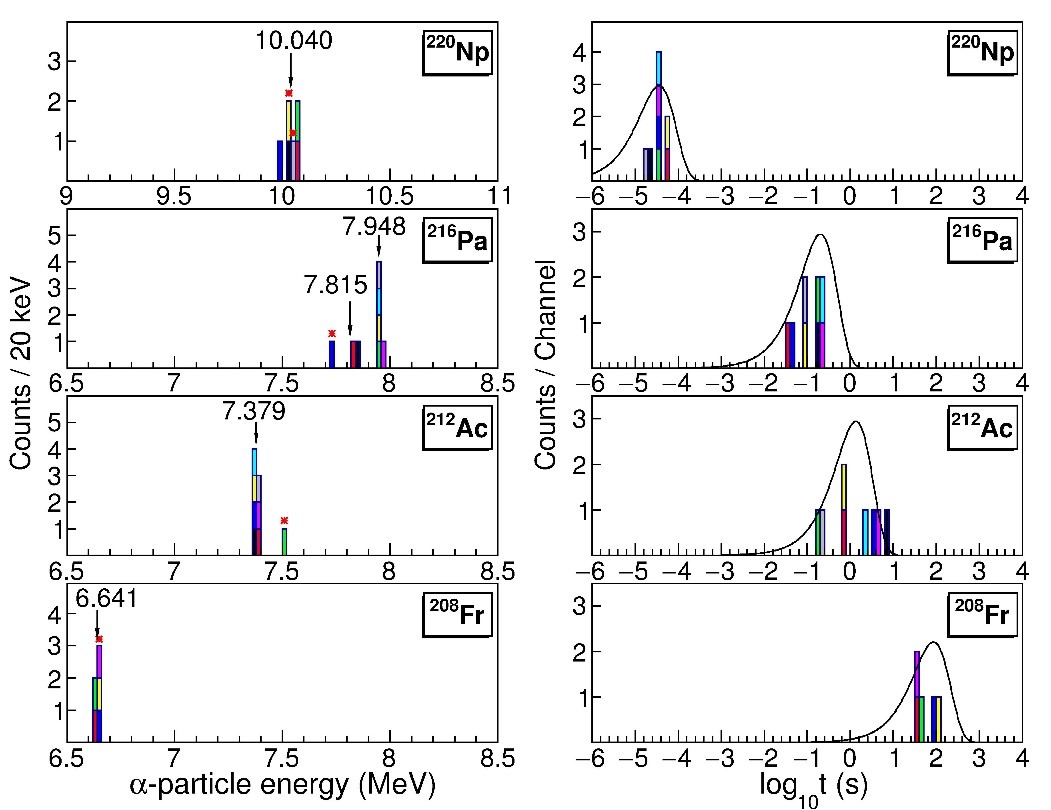 图1:实验测量的220Np衰变链中各核素的α衰变能谱(左)和α衰变寿命的分布(右)。